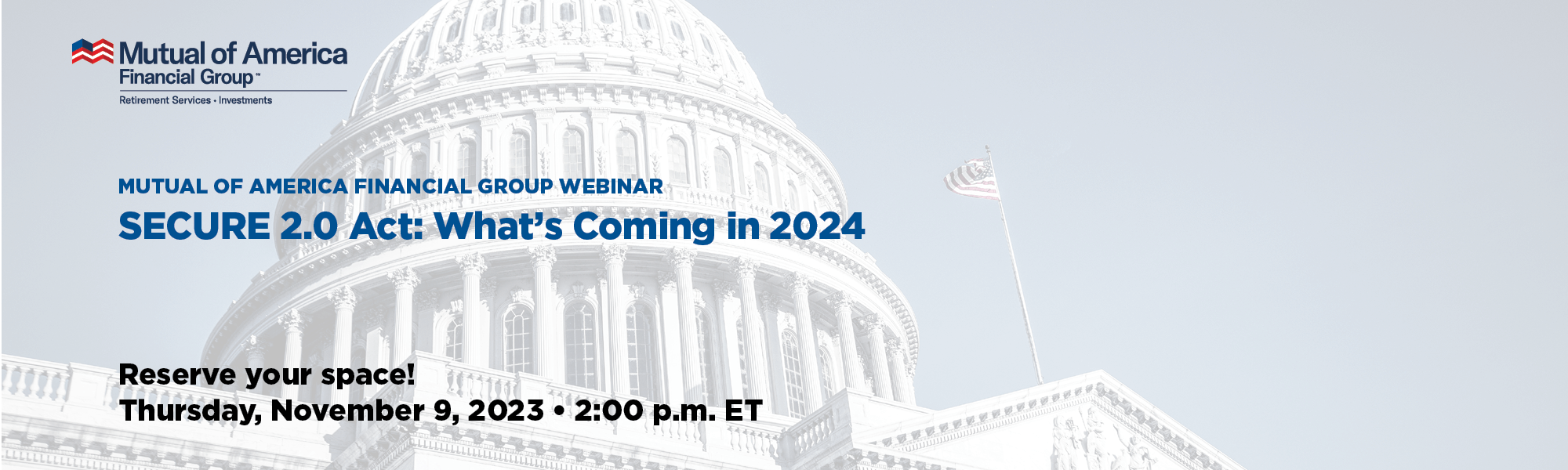 Therefore, we would like to invite you to join our Corporate Leadership Partner, Mutual of America, for a special webinar. “SECURE 2.0 Act: What’s Coming in 2024,” with speakers Nick Curabba, senior vice president and associate general counsel, and Earl Jones, vice president of National Accounts, on Thursday, November 9, at 2 p.m. ET.