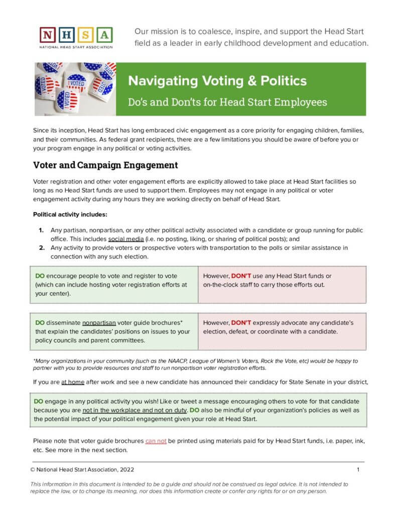 Short answer: YES! Just not on Head Start’s time. Head Start programs are explicitly allowed to participate in voter registration so long as Head Start funds are not used. Download the “Do’s and Don’ts for Head Start Employees” resource for more information.