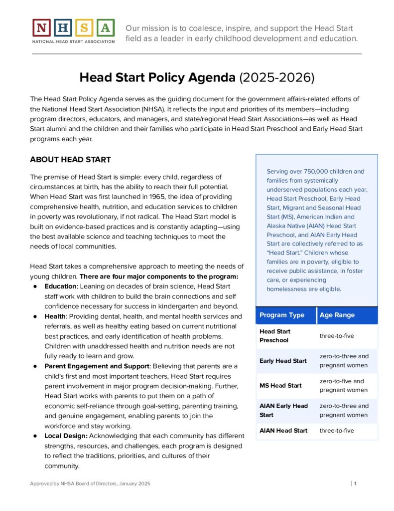 The national Head Start Policy Agenda serves as the guiding document for the National Head Start Association’s government affairs-related efforts. Based on the needs and feedback of the Head Start community, the agenda provides a roadmap for NHSA’s policy engagement and informs advocacy for changes in current law, regulation, and practice. These recommendations are pursued independently and collectively, and in consultation with local Head Start practitioners and Head Start families. The federal agenda includes an overview of Head Start’s positions and priorities on policies affecting children from at-risk backgrounds and their families, including legislative and regulatory policy at the federal and state levels. The agenda also outlines recommendations that represent the Head Start community’s priorities in these areas, focused primarily on Head Start and Early Head Start.